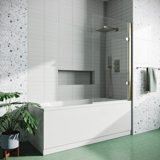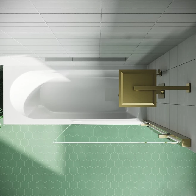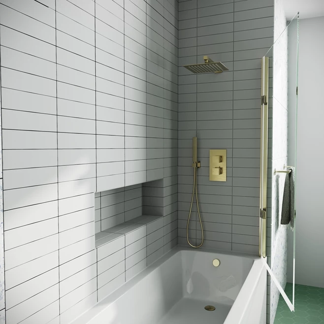 • Bath screen included for an effortless purchase – choose between square or curved corner with Brushed Brass profile
