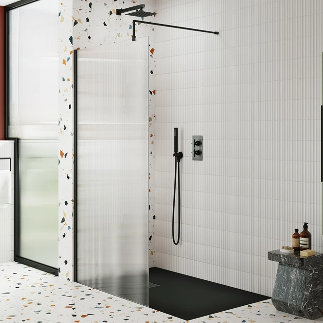 Harbour Contour 8mm Fluted Matt Black Glass Screen for Walk in Shower & Wetrooms