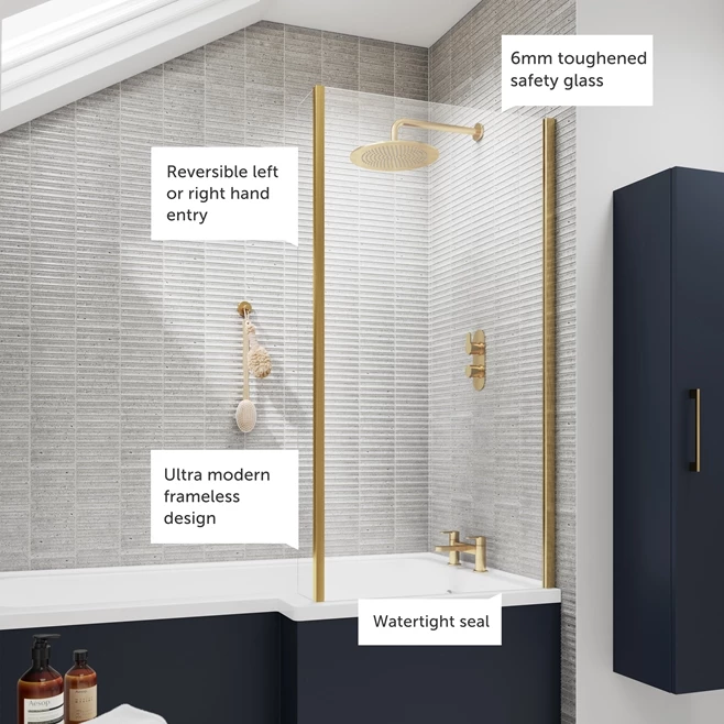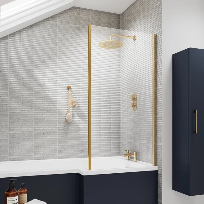 Vellamo Brushed Brass L-Shaped Bath Screen With Fixed Return – 1435 x 805mm