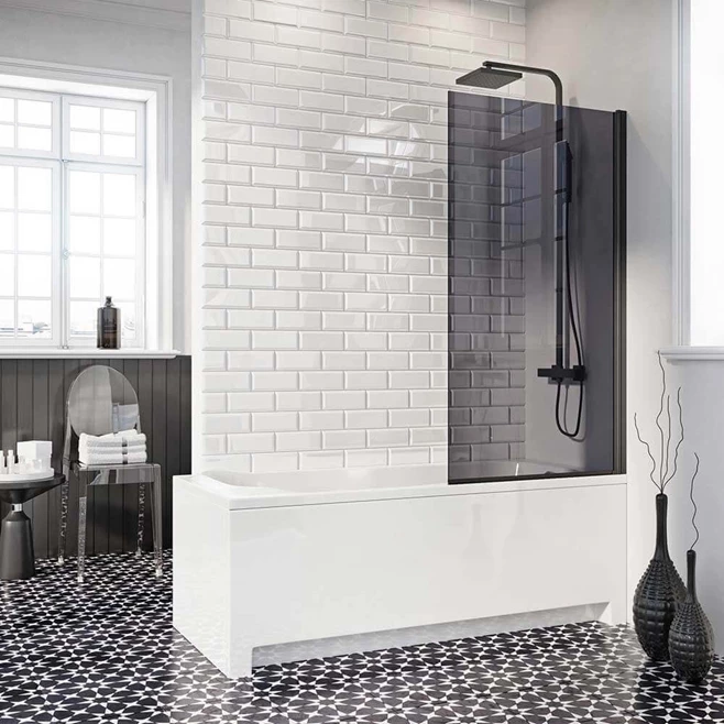 Vellamo Matt Black 6mm Smoked Black Hinged Bath Screen – 1400 x 800mm